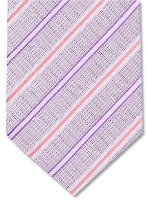 Gravata Jacquard Polyester na cor cinza com listras roxas, lilás e salmão.